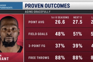 从左至右依次为生涯前6个赛季、中间6个赛季、最近6个赛季