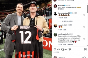 NFL传奇四分卫布雷迪来到圣西罗球场,现场观看这场比赛,他与伊布合影,并获赠印有自己名字的米兰球衣。