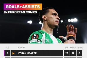 自安东尼于2025年2月1日加盟皇家贝蒂斯以来,在不含预选赛的欧战中,仅有姆巴佩(17球)参与的进球数多于安东尼。