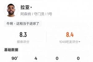 体育资讯2月23日讯 英超第27轮焦点战,阿森纳4-1战胜热刺。拉亚首发出战,表现出色,贡献全场最多的4次扑救,评分8.3。