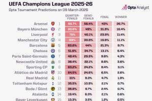 OPTA预测比赛欧冠夺冠概率