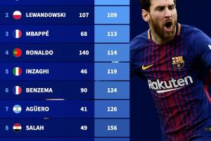 体育资讯03月11日讯 德国足球转会市场统计并列出了欧冠历史上,所有至少打进20球的球员中,每球平均用时最短的球员前十。梅西以平均105分钟一球排名第一,莱万、姆巴佩排名前三。