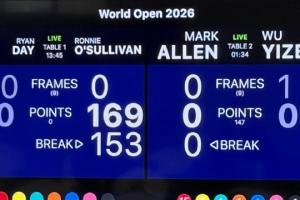 第一局奥沙利文单杆打出罕见的153分。 由于瑞恩·戴违规,奥沙利文通过自由球上手,完成了单杆清台的壮举。