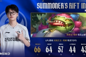 LPL赛事使用塔姆场次最多的选手TOP5如下,其中Meiko以66次使用位列第一;