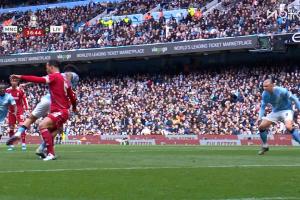 体育资讯04月04日讯第37分钟范戴克放倒奥赖利,曼城获得点球