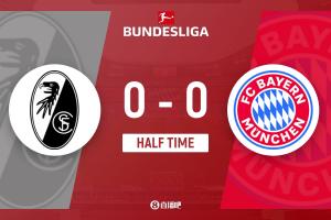 上半场伤停补时3分钟,半场结束,拜仁暂0-0弗赖堡。