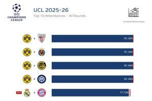 本赛季欧冠上座人数前十: