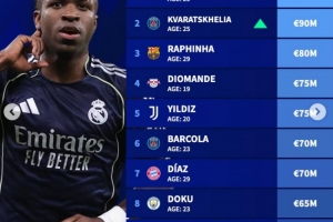 体育资讯4月13日讯 德转更新了足坛左边锋身价情况,维尼修斯以1.5亿欧居首,K77以9000万欧位居次席。